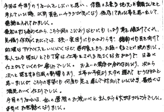 工事の予定より大幅に遅れて、どうなるかと思いましたが、こちらの要望にも何度も足を運んで対応して頂き、最後には満足のいく仕上りでした。
