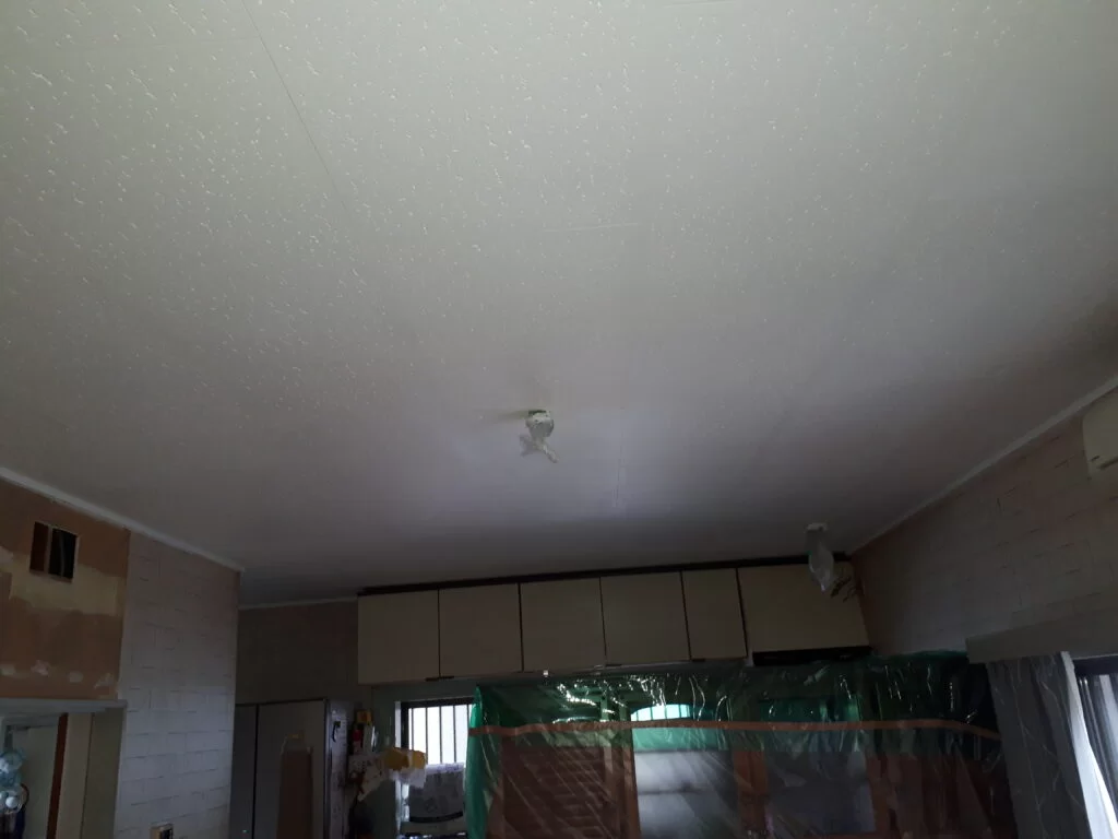 現場親方ブログ【施工現場より】 ジプトーン天井塗装作業こんにちは塗装施工担当武内です。今回は室内の天井の塗装作業を行います。天井材はジプトーンを使用しています。事務所や店舗の天井でよく使われます。👆️キッチン天井施工前比較的に綺麗な状態ですが、掃除・シーラー塗布を施工手順に加えます。👆️洗面所天井施工前こちらもシミが目立つため、念のためシーラーを塗布してから上塗り作業を進めます。👆️キッチンの天井施工後独特な柄の黒い部分もくぼんでいるので、何度もしっかり塗りこんで仕上げました。👆️床・クロス工事含め完了しました。無料お見積はこちら