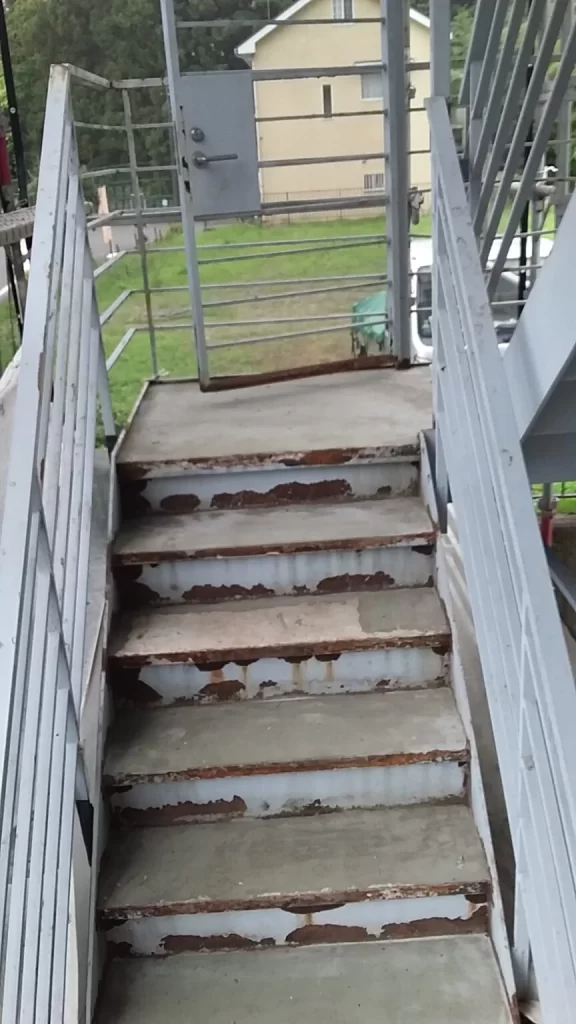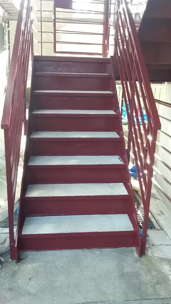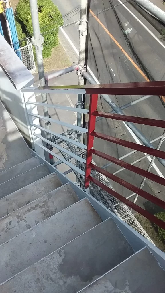 現場親方ブログ【施工現場より】 鉄骨階段塗装こんにちは塗装施工担当武内です。今回は鉄骨階段の塗装です。 ステップ部分はコンクリート造りです。鉄骨階段の耐用年数は19年~30年と言われています。錆びて穴があくと内部に水が入り内部から浸食されてしまう場合が多いので、適切な時期に手入れを検討して頂きたいと思います。塗装作業前 (水洗い洗浄とケレン作業済み)状況塗装作業中 (グレー色・錆止め 赤色・上塗り材)鉄骨部分塗装完了ステップ部分には長尺シートを張って仕上げました。無料お見積はこちら