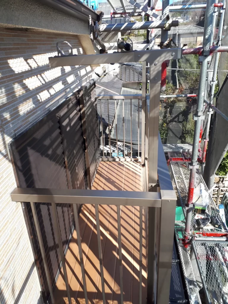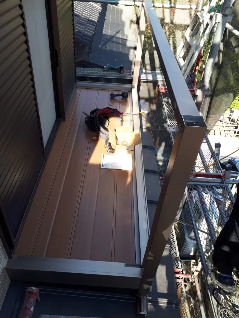 現場親方ブログ【施工現場より】ガルバニウム鋼板張り作業とベランダ設置作業こんにちは塗装施工担当武内です。前回の作業の続きを進めていきます。前回の下地の上にガルバニウム鋼板を張りました。アルミのベランダを設置していきます。 ベランダの土台となる骨組みを組み立てていきます。土台が組み上がったので、床を張ります。フェンス・物干し台を組んで完了です。無料お見積はこちら