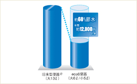 トイレのリフォームでよく話題になるのが、流したときの水の量のことです。昔(20年以上前)のトイレは1回レバーをひねるごとに13ℓ~15ℓの水が流れました。近年では大で8ℓ、小で6ℓ、というのが標準になっていましたが、今では、大でも6ℓという水量の便器が開発されました。これからはこの大でも6ℓが一般的になるでしょう。これは言い換えれば、トイレにかかる水道代が半分以下になることを意味します。これは大きな差ですよね。世の節約傾向も手伝って、このためにトイレリフォームを決心したという人もけっして少なくありません。