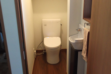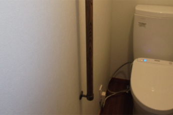 躯体が重量鉄骨ということで鉄骨の柱が出っ張りがトイレの空間を邪魔したり、ブレスの関係で天井を納めるのにお客様と関係者で相談して、一見変わった天井にしてみました。
