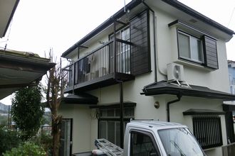 緑区三ヶ木のH様宅の外壁とベランダ、玄関の工事を請け負いました。当初は玄関までは考えていなかったのですが、隙間風が入って寒いと言うことで、カバー工法による断熱ドアを入れることになりました。外壁の色はアイボリーに対してベランダと玄関をダークブロンズにしてシックなイメージに仕上げました。