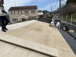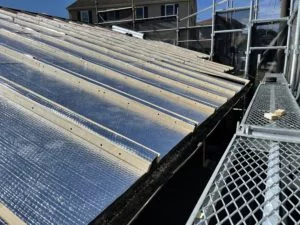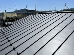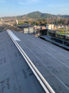 今回は、既存の屋根と新規の屋根の間に空気層を作る事で、熱気を防ぎ、棟(屋根の頂点部分)の通気口から熱気を逃がす構造を作りました。