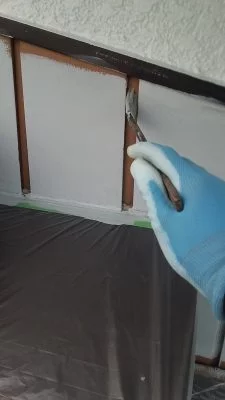 現場親方ブログ相模原市 緑区 М様邸 外壁塗装を行いますこんにちは。リ・フォーユーの武内です。引き続き 相模原市 緑区 М様邸の外壁塗装を行います。↑まず、上部のモルタル壁と軒裏天井を白色で統一させるようにに塗装していきます。↑次に下部のスチール製のサイディングを塗装していきます。↑鉄部なのでサビ止めを塗装します。まず、ローラーで塗ります。↑細かい所は刷毛で入れていきます。ダレないように注意して塗ります。↑サビ止め完了です。無料お見積はこちら
