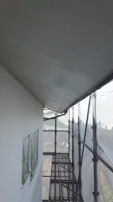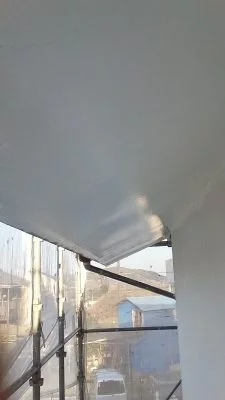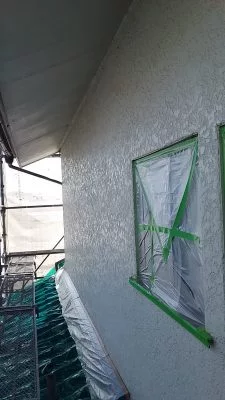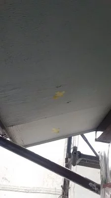 現場親方ブログ相模原市 緑区 М様邸 外壁養生と下塗りを行いますこんにちは。リ・フォーユーの武内です。相模原市 緑区 М様邸の施工の続きを行っていきます。↑サッシや下屋根等の養生を行います。↑外壁には白色の下塗り材を塗布します。↑軒裏天井は、今回白い艶のある塗料で塗装を行いました。↑このように、軒裏天井が一部破れて穴の空いている箇所については張り替えた後に塗装を行います。無料お見積はこちら