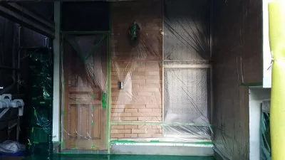↑玄関扉は交換しますが、汚したくないので養生します。