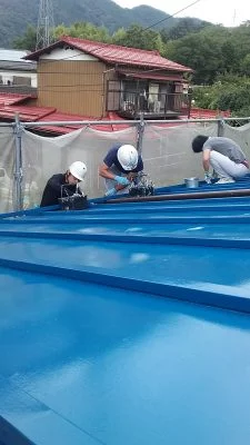 現場親方ブログ相模原市 緑区 M様邸 トタン屋根塗装こんにちは。リ・フォーユーの武内です。相模原市 緑区 M様 トタン屋根塗装の中塗りと上塗りを行います。↑前回、錆止めまで塗装済みです。↑細かい所から先に塗装していきます。(足の踏み場を確保するため)↑全体的に塗装していきます。中塗り完了です。↑後日、上塗りを行いました。↑建具部門、大工部門の皆さんにも手伝ってもらいました。ありがとうございます。↑昔ながらの良い青色です。↑屋根は完成です。次回は壁の塗装に移ります。無料お見積はこちら