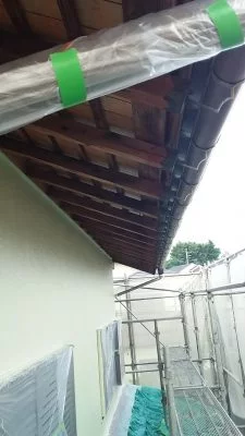 現場親方ブログ相模原市 緑区 O様邸の軒裏天井塗装を行いますこんにちは。リ・フォーユーの武内です。相模原市緑区O様邸の作業の続きです。前回、木部のアク洗いを行ないましたので塗装を行います。↑塗装前です。↑吹き付け塗装ができない塗料なので、刷毛とローラーで塗っていきます。↑今回は赤っぽい色を選択しました。↑程よく重厚感がでますね。外壁の方も進めていきます。無料お見積はこちら