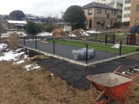 代表親方ブログ防草シートの上に接着剤を使って人工芝施工。