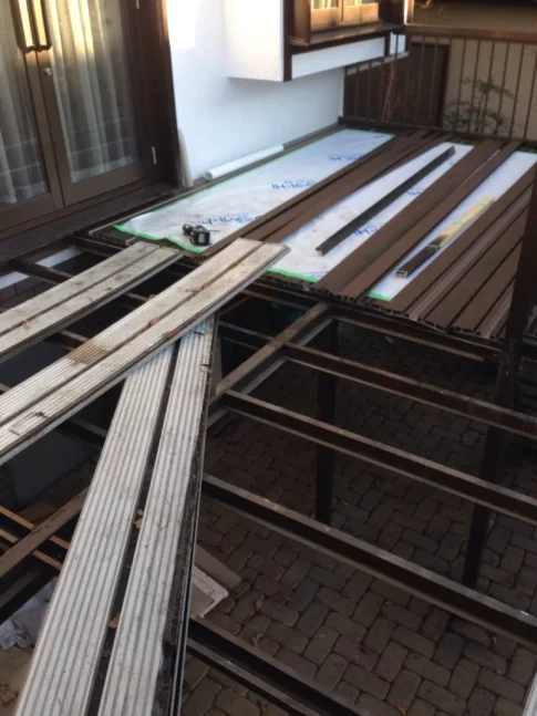 代表親方ブログ相模原市緑区外装リフォーム現場です。25年経った塩ビデッキ材を木粉複合樹脂のデッキに張り替えします。
