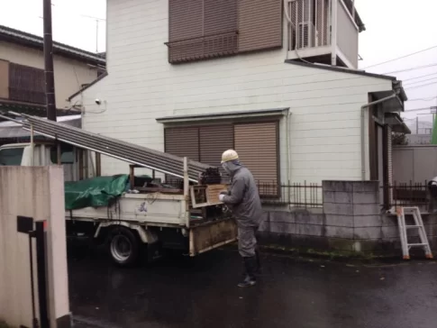愛川町外装リフォームのU様邸の着工です。あいにくの雨になってしまいましたが、足場架けをしていきます。