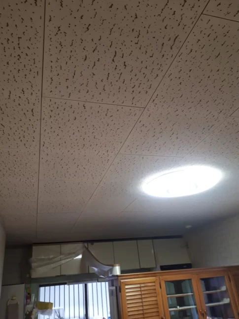 現場親方ブログこんにちは塗装施工担当武内です。 今回は室内の天井の塗装作業を行います。 天井材はジプトーンを使用しています。事務所や店舗の天井でよく使われます。 👆️キッチン天井施工前 比較的に綺麗な状態ですが、掃除・シーラー塗布を施...
