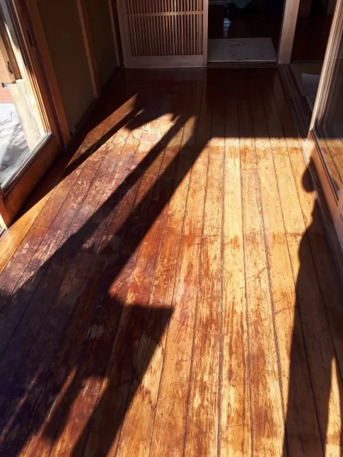 現場親方ブログこんにちは塗装施工担当武内です。 今回は無垢材の床を綺麗にする施工です。 縁側の床の施工前状況です。 経年の細かいキズや日焼けやシミが目立ってしまっています。 表面を削っていきます。 細かいキズの深さまで削りつつ、削り跡...