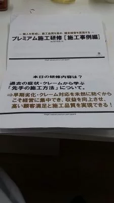 現場親方ブログこんにちは。 リ・フォーユーの武内です。 先日、社長と、都内で開催された塗料メーカーの研修会に参加してきました。 遠くは長崎から参加されていた方もいらっしゃいました。 ↑「施工方法の徹底と施工不備の事例」という事で、過去...