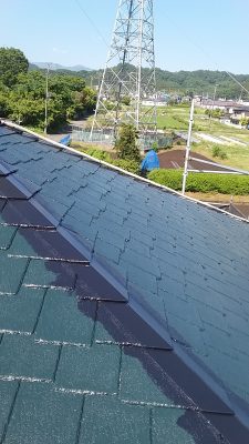 現場親方ブログこんにちは。 リ・フォーユーの武内です。 相模原市 緑区 H様邸 屋根塗装の上塗りから行っていきます。 ↑先に細かい所を塗装していきます。 ↑ローラーブラシで塗布していき、仕上げていきます。 屋根の上塗り完了です。