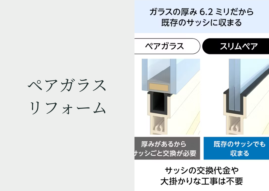 なので、ペアガラスリフォームとは、窓ガラスをペアガラスに入れ替えたり、既存のペアガラスをより高性能なペアガラスに入れ替えるリフォームのことを指します。